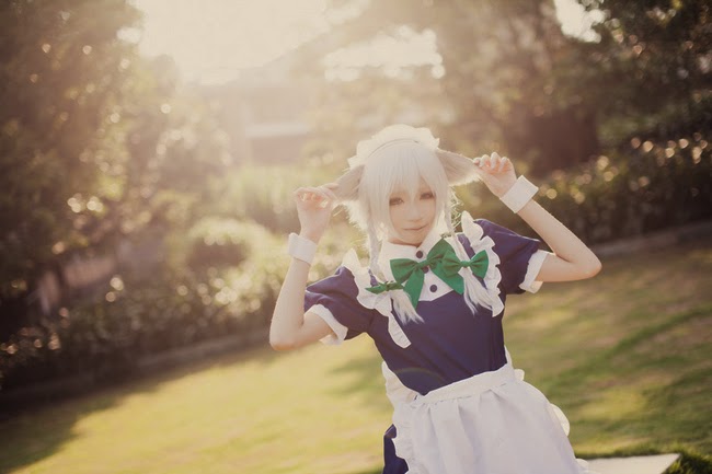 Sakuya Izayoi is the Chief Maid who serves Remilia Scarlet,the head of the Scarlet Devil Mansion.Sakuya is the only human living in the Scarlet Devil Mansion.She essentially takes the position of managing the Scarlet Devil Mansion. Easily one of the most enigmatic characters despite appearing in so many games, Izayoi Sakuya is the Chief Maid of Scarlet Devil Mansion who has the power to stop time.She possesses an ability to manipulate time,so she is able to stop time.she is able to change the speed of the flow of time.She possesses a great amount of silver throwing knives and is skilled at handling them,and with only her ability to manipulate time,she is skilled in conjuring knives from nowhere.According to ZUN and therefore is skilled at cooking.Check the following Izayoi Sakuya cosplay please: